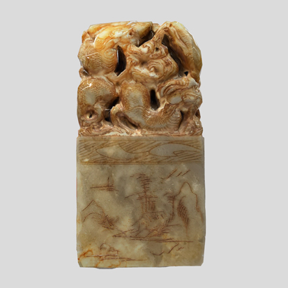 早先的印章的印钮除了简单的台钮和坛钮之外,通常以动物为题材。而随着私印的增多以及印材的丰富,印钮的题材也越来越多,从盘螭钮、天禄钮、辟邪钮、虎钮、鱼钮等动物钮,再到人物钮、山水钮……不一而足,但最为古朴也最为常见的仍是寓意吉祥的古兽钮。